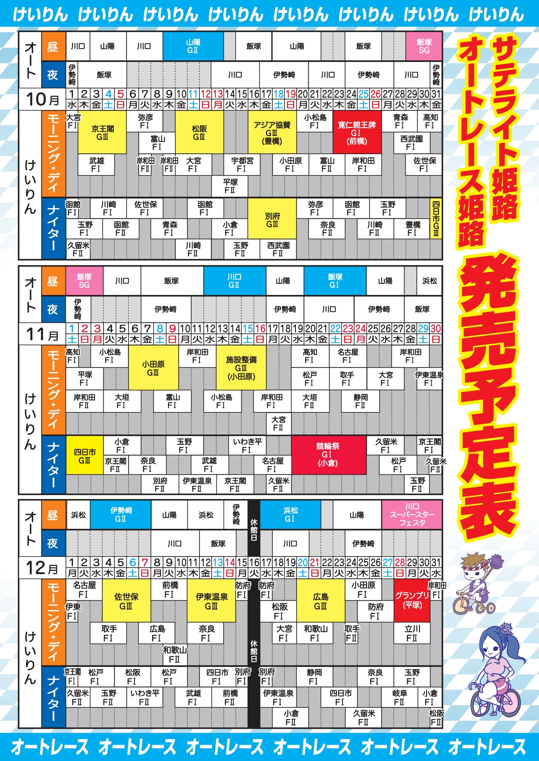 10月23~26日の4日間、前橋競輪場でGⅠ「寛仁親王牌」が開催されます。 サテライト姫路では25日に先着60名様に『飲むこんにゃくゼリー』をプレゼント。最終日の26日には現金1万円や群馬県の名産品などが当たるガチャ抽選会を開催しますので、どうぞお楽しみに。 また、開催期間中は予想紙『競輪研究』