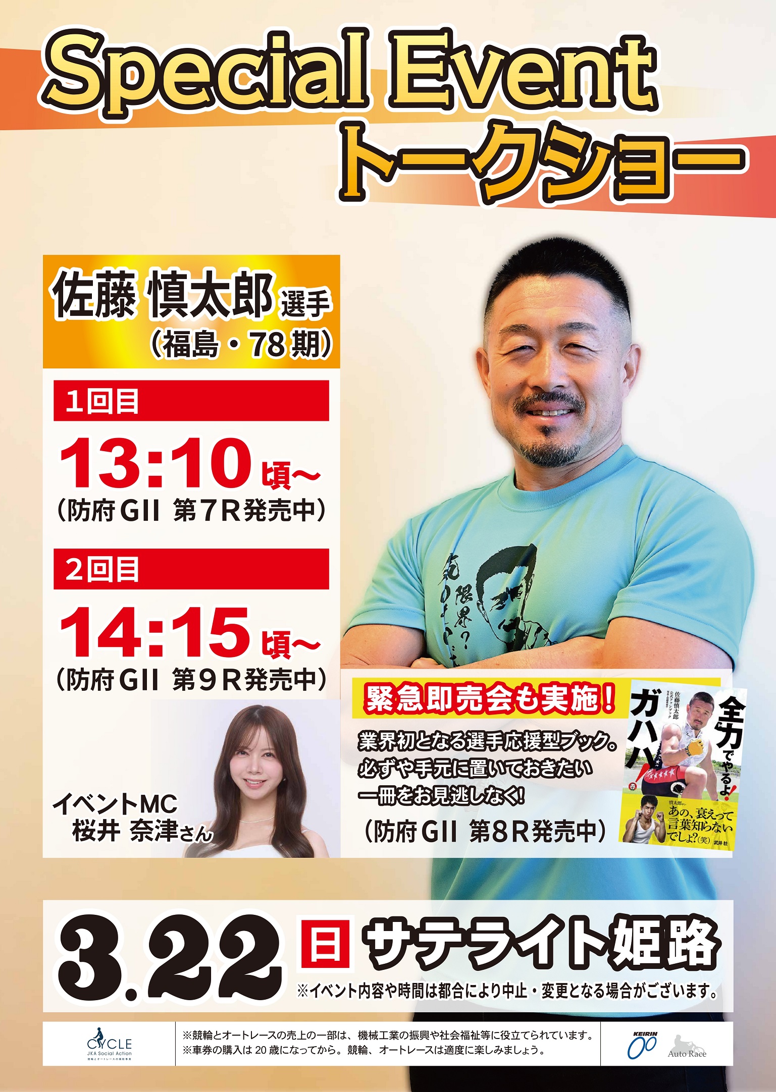 COLUMN投稿 アクセス イベントカレンダー 発売日程 レース結果 ガイダンスコーナー 館内施設紹介お知らせ お知らせ お知らせ 2026.03.08 佐藤慎太郎選手トークショー 3月22日(日)GⅡウィナーズカップ最終日に、佐藤慎太郎選手(78期・福島)のトークショーを開催します。 1部と2部の間にはファンブックの即売会も実施。購入者にはサインだけでなくご本人から直接手渡ししていただけます! ビッグなレースとビッグなゲストをどうぞお楽しみに! < 前のコラムへ 次の投稿へ > 投稿一覧へ戻る