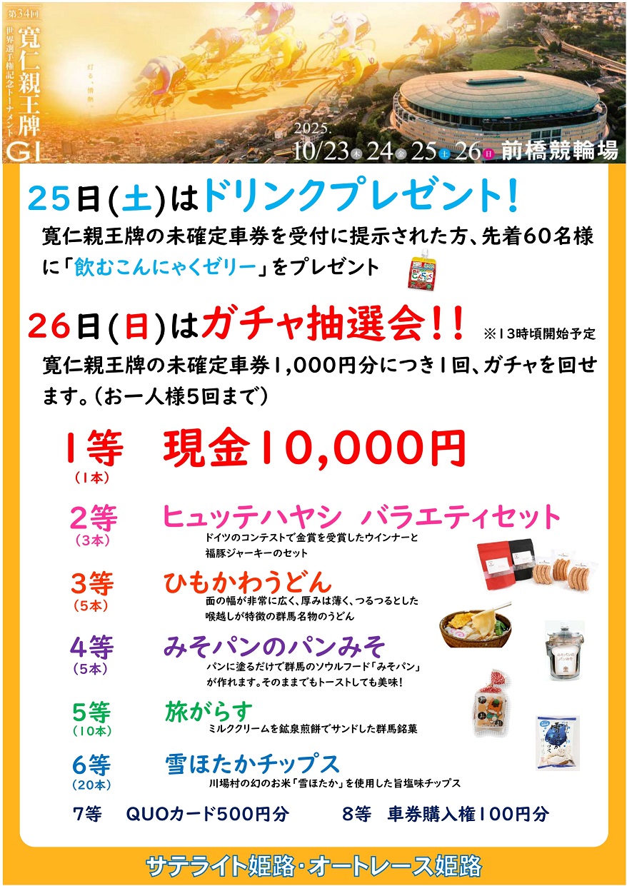 10月23~26日の4日間、前橋競輪場でGⅠ「寛仁親王牌」が開催されます。